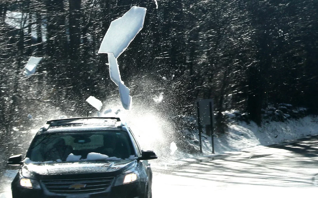 When snow or packed ice is left on a vehicle’s roof, hood, or trunk, it can break loose while driving. At highway speeds, wind pressure can lift ice sheets off like a sail — turning them into dangerous airborne projectiles.